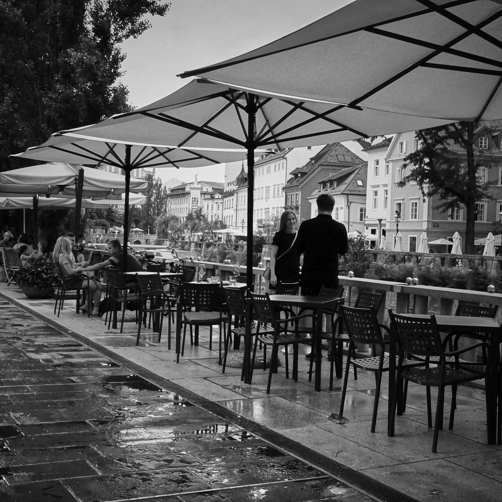 I instinctively grabbed this shot when I saw it, marching as I was, on a whirlwind guided city tour. The compositional lines of the pavement curb and umbrellas receding into the shot are really pleasing and the fact that they are centralised on the left edge of the frame works well. The shining wet street and the main couple in the shot particularly caught my eye at the time and I just knew there was something there. A shame I couldn’t stop to make more of it but I am pleased with what I managed to grab considering. Recently, a friend suggested I tried to make something of it as it was originally a little dark on the faces of the cafe-goers. This is the result. I wonder what the conversation was…..