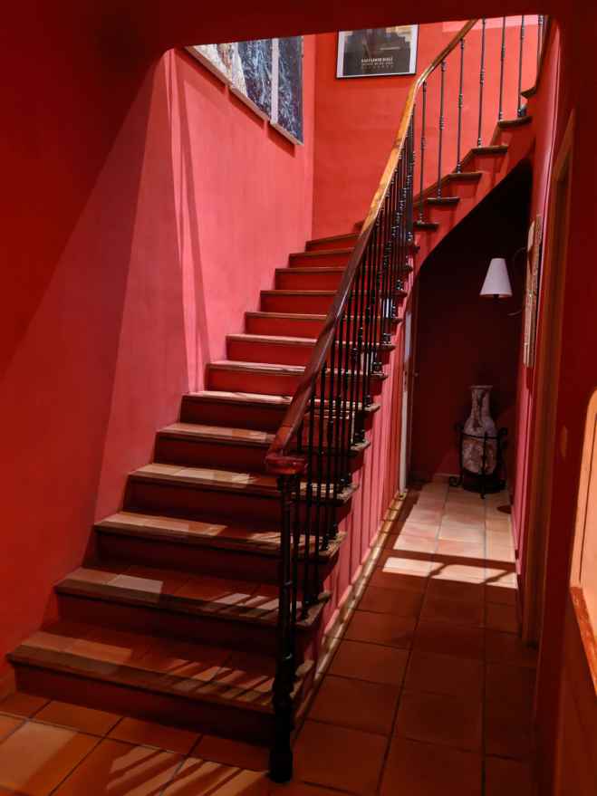 Taking the first image, the sweep of the stairs defines a perfect diagonal from bottom left to top right and I love the fact that the surround is not broken in that top right-hand corner, nor the stairs in bottom left, and frame the image. The light is lovely, which is what drew me to take the picture with strong contrast of light and shadow around the image and that beautiful red colour dominating. For being such a simple, even boring subject, I currently have good feelings for this image.
